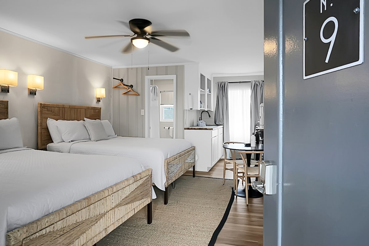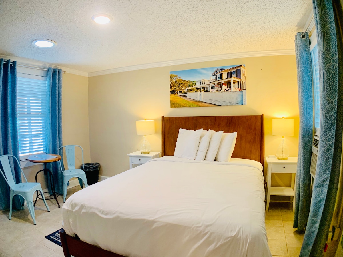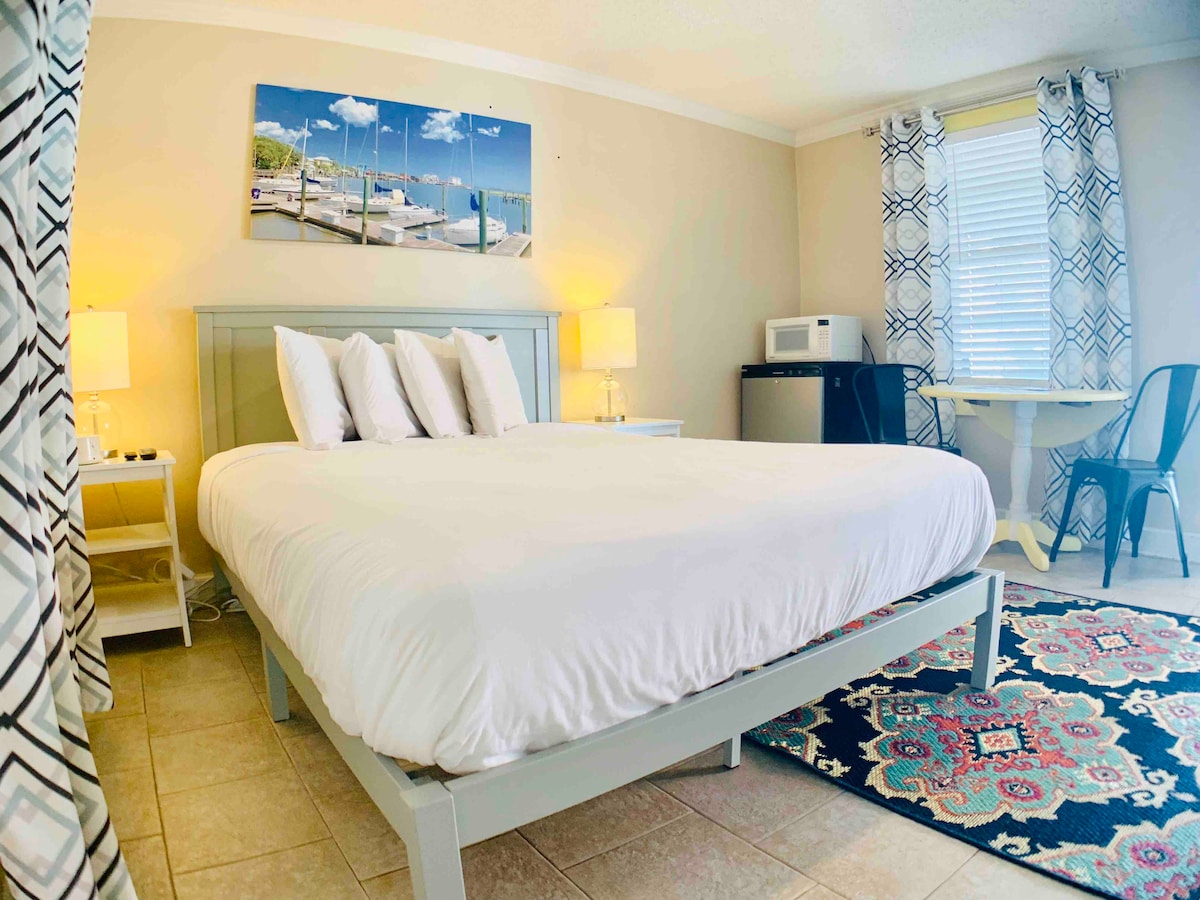 Come stay awhile at the new Starlite Inn. The Inn is newly renovated with a mid-century modern design and just steps away from the heart of Carolina Beach. Your room will accommodate up to 2 guests. Top grade linens and plush towels. This room has one king size bed as well as a mini fridge and Keurig coffee maker. This unit has a private bathroom with a stand up shower. Once you're settled, it's time to relax and unwind at the beach! *One assigned parking spot per room.