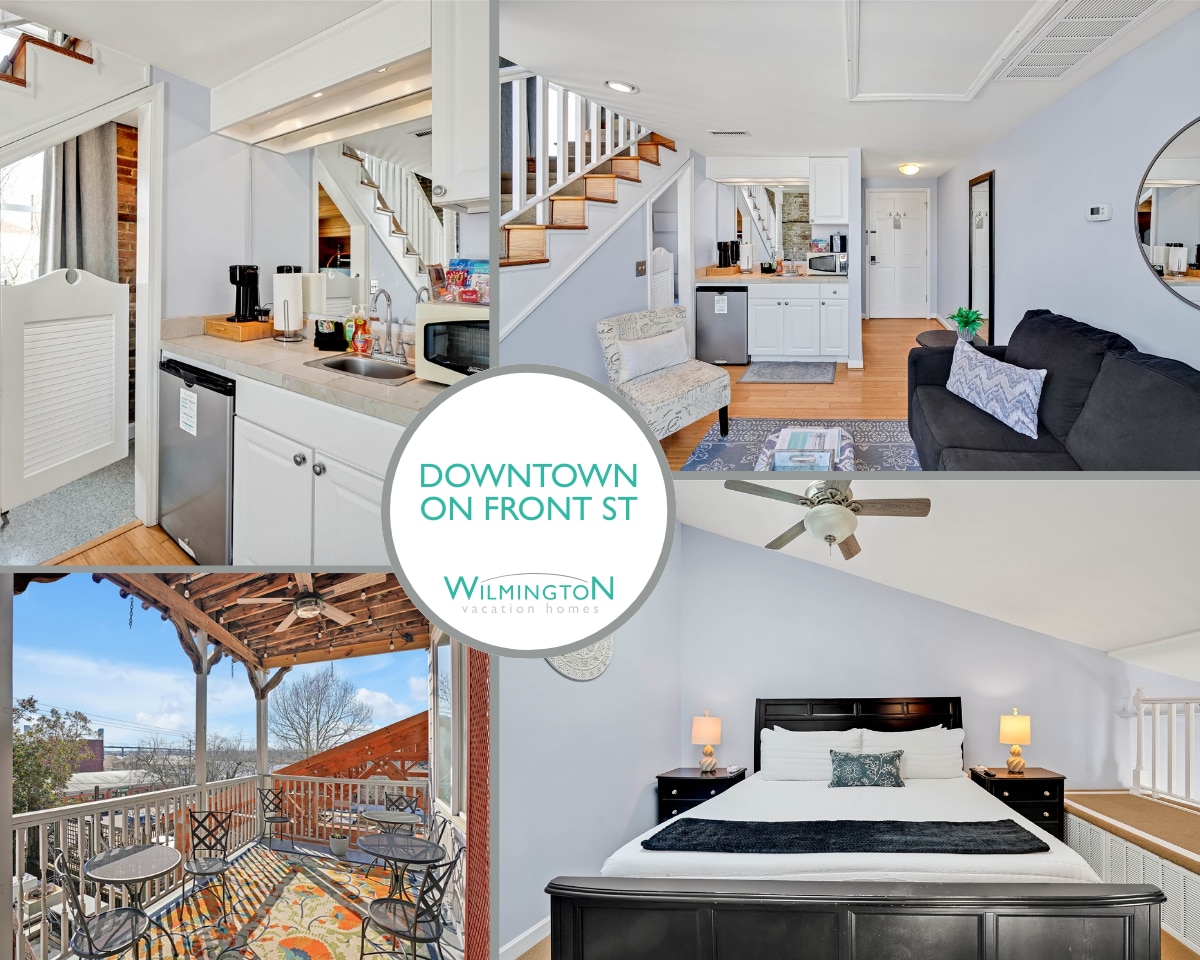 Welcome to a charming, cozy getaway perfectly located in Midtown Wilmington between Wrightsville Beach and historic downtown. The 2ndfloor loft features wide plank pine flooring, a king bed, a sofa, stainless appliances, and a private deck to enjoy hearing live bands that perform nearby. You are within walking distance of unique local coffee shops, bookstores, art, and restaurants. The Cross-City trail is a few steps away for those desiring to start their morning with a bike ride, walk, or run.
