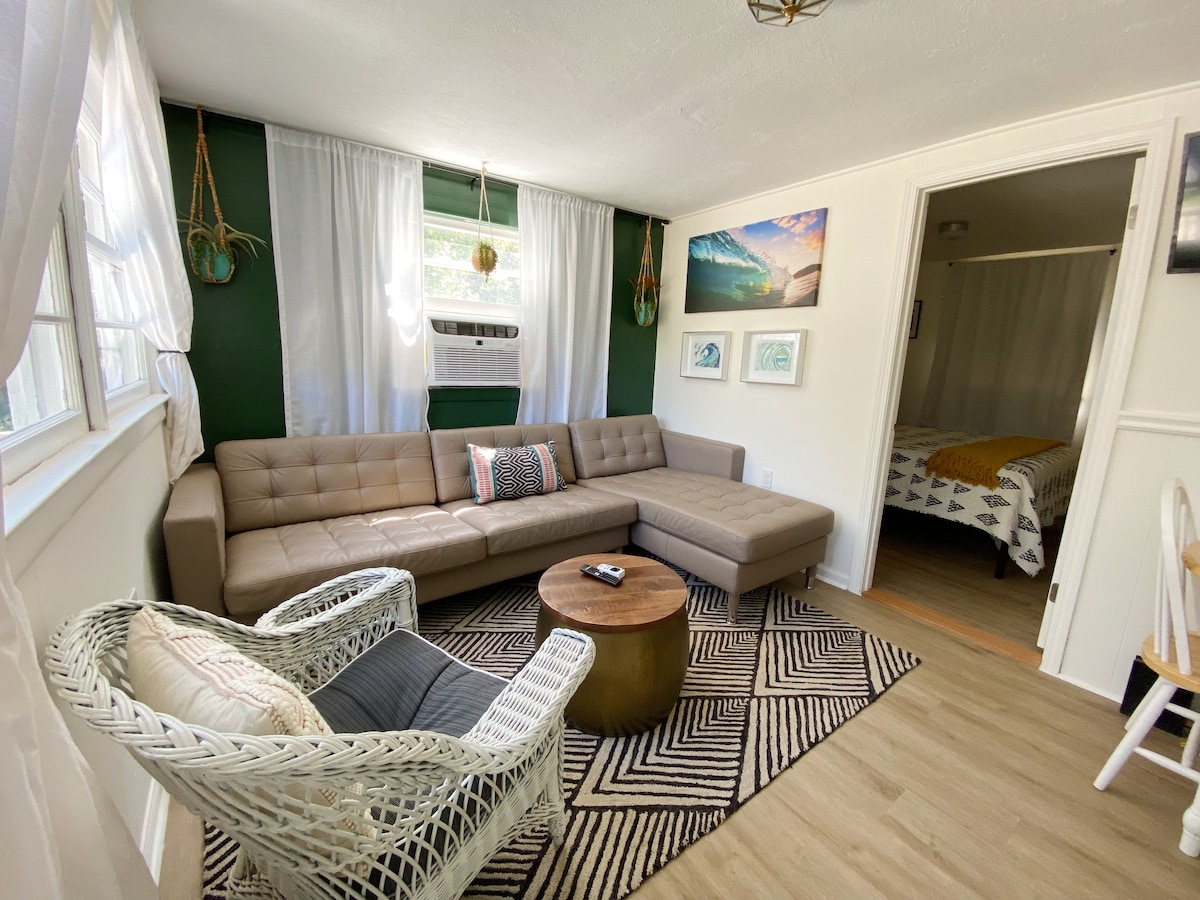 At 440 square feet this one bedroom studio style guesthouse lives large both inside and out! Amazing location just 4 minutes to Wrightsville Beach, 6 minutes to UNCW, and 15 minutes to Wilmington's historic downtown riverfront without traffic. Large covered back patio with plenty of space to relax, grill, and eat. Reliable high speed internet makes this a great place to stay connected with work.