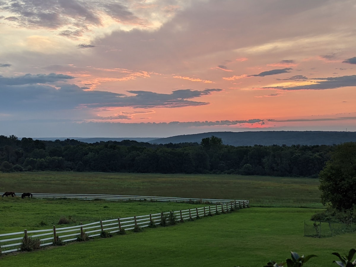Relaxing country setting secluded off a long private driveway, on a dead end road, in historic Lebanon, Connecticut. Horses line the driveway, and chickens roam the yard. Sunrises over the backyard amongst the tree covered hills. The private accessory apartment, attached to the main home, includes one bedroom, living area, kitchen, bathroom, & porch. Witness the bustle of the active homestead. Relatively close to landmark casinos (Foxwoods & Mohegan Sun), hiking, the shoreline & historic sites.