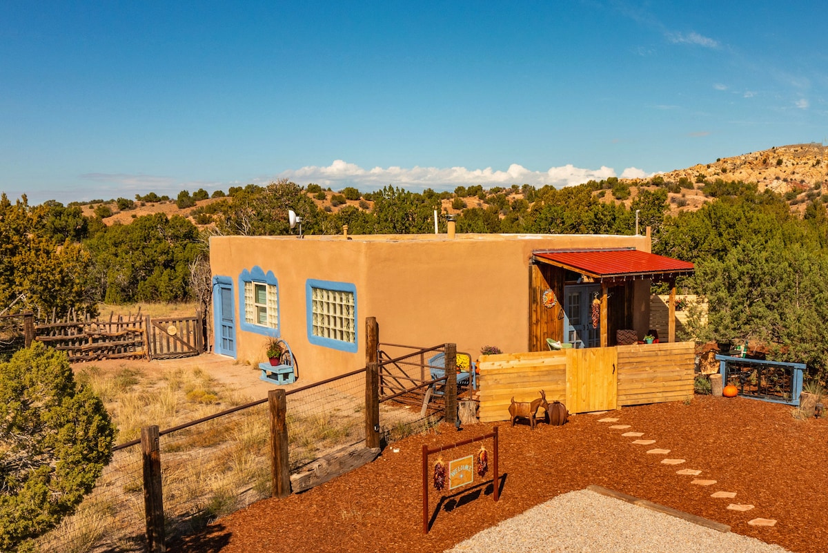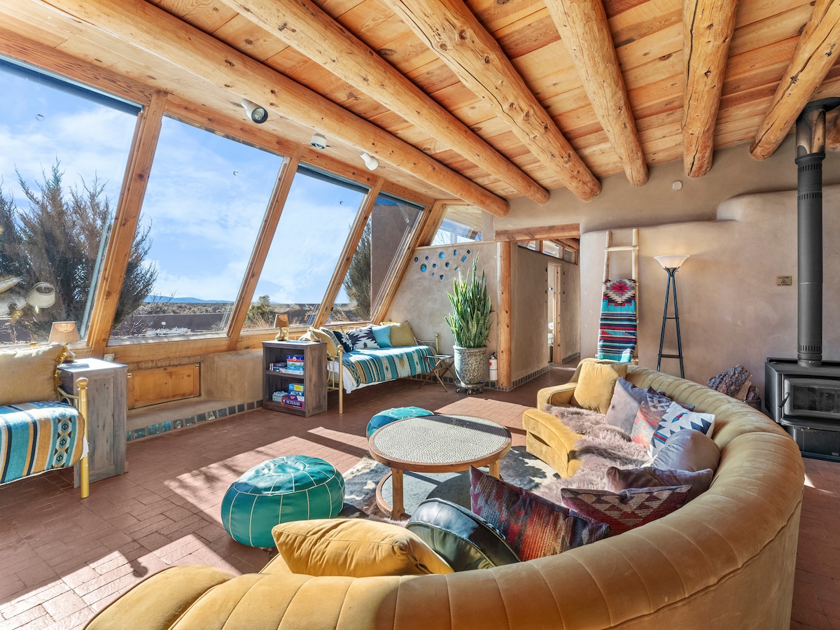 Discover the magic of the Land of Enchantment in this unique, one-bedroom, one-bathroom custom Earthship. This sanctuary is thoughtfully crafted to blend seamlessly with its breathtaking surroundings, providing an immersive experience in luxury off grid living. Designed with sustainability at its core, the Earthship features solar power, rainwater collection, and propane systems, allowing you to minimize your environmental footprint while enjoying maximum comfort.