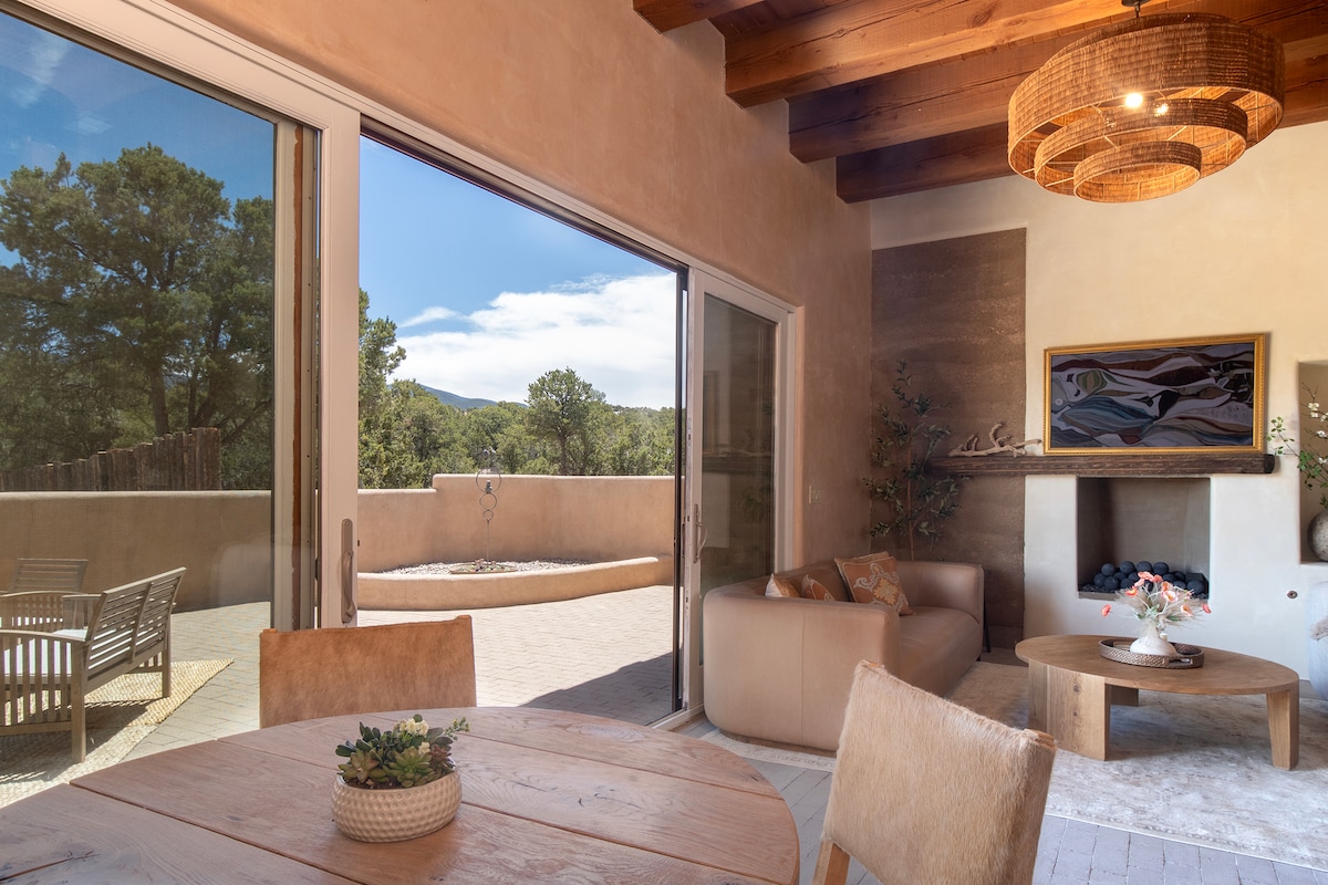 Want a unique, stylish, peaceful stay in Santa Fe? Happy Ram is an architect-designed, professionally decorated home on a 6.4-acre estate. Huge views of the Sangre de Cristo mountains from every room. Thick rammed earth walls create incredible quiet. Bedrooms on opposite sides of the home for maximum privacy. Patio with fireplace. Just 5 minutes to hip Tesuque Village, 6 to Four Seasons Resort, 11 to Santa Fe Opera, 14 to Santa Fe Plaza. Make your Santa Fe dream vacation come true! STRO-40172