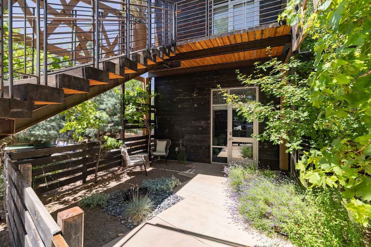 Luxury designer ground-floor apartment in Santa Fe's Baca Railyard District. Fully equipped chef's kitchen with dining for 4, dishwasher, laundry. private patio, steps from Cafecito (coffee shop), central to Meow Wolf, Railyard Park, and the Plaza. + Full Kitchen + Dishwasher + Washer/Dryer + Comfy King Bed + A/C & Radiant Heat Easy downtown access via scenic trail. High-speed internet. King bed with lux sheets. Whole Foods & Trader Joe's nearby. Additional units available.