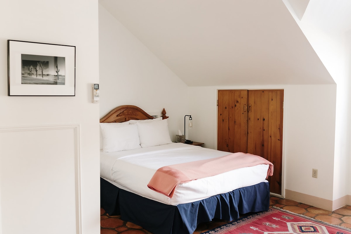 As seen in the New York Times and steps from the historic plaza, our King Suite offers generous space and quiet sophistication: a king bed dressed in exceptional linens, a separate living room with warm, contemporary furnishings, and a queen sofa sleeper. Designed to feel more like a private residence, we invite you to settle in and stay awhile. After exploring the Plaza, unwind in the gallery, the den, or our on-site café and sushi bar. Complimentary off-site parking is included.