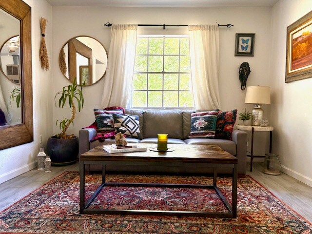 Wake up to morning sunlight streaming through french doors and then sip coffee in your own private garden area. This cottage offers wonderful character including exposed wood-beam ceiling, pink refrigerator and a shabby-chic kitchen table. Kick back with a book on the sofa amid the eclectic artworks, vivid hardwood floors, and antique chandeliers within this serene getaway. Set in central Santa Fe, you are steps away from trendy boutiques, cafes and art galleries.