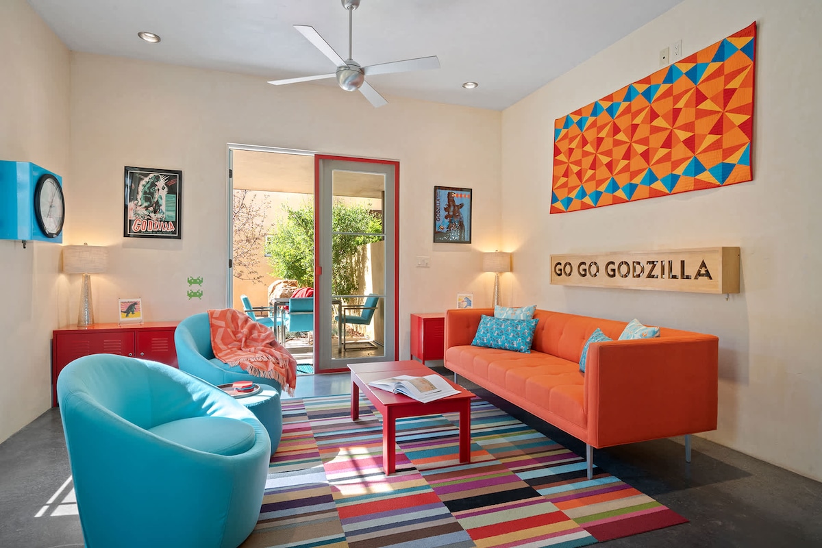 Casa de Luxx: Two Bedroom Wing is a private section of the house with its own entrance located between the Plaza & Meow Wolf. Hot tub, a sauna, and a pool open year round. Includes two comfortable bedrooms, bathroom, office, kitchenette, fire pit & patio. Peaceful with beautiful views. This wing does NOT include a full kitchen, living room, kitchen sink, or sofa. For these, book Casa de Luxx or Casita de Luxx. Tesla/EV charger.