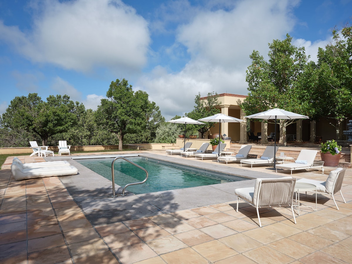 Set a tone of relaxation and privacy for your next trip to Santa Fe in this 8,000-square-foot estate house. The Ridge uniquely blends a traditional territorial style hacienda with contemporary art and design. We look forward to welcoming you to this luxury boutique experience in the tranquil mountain desert landscape of Northern New Mexico. Experience the magic of Santa Fe at The Ridge with optional concierge services that include private chefs, car services, yoga, and a spa menu.