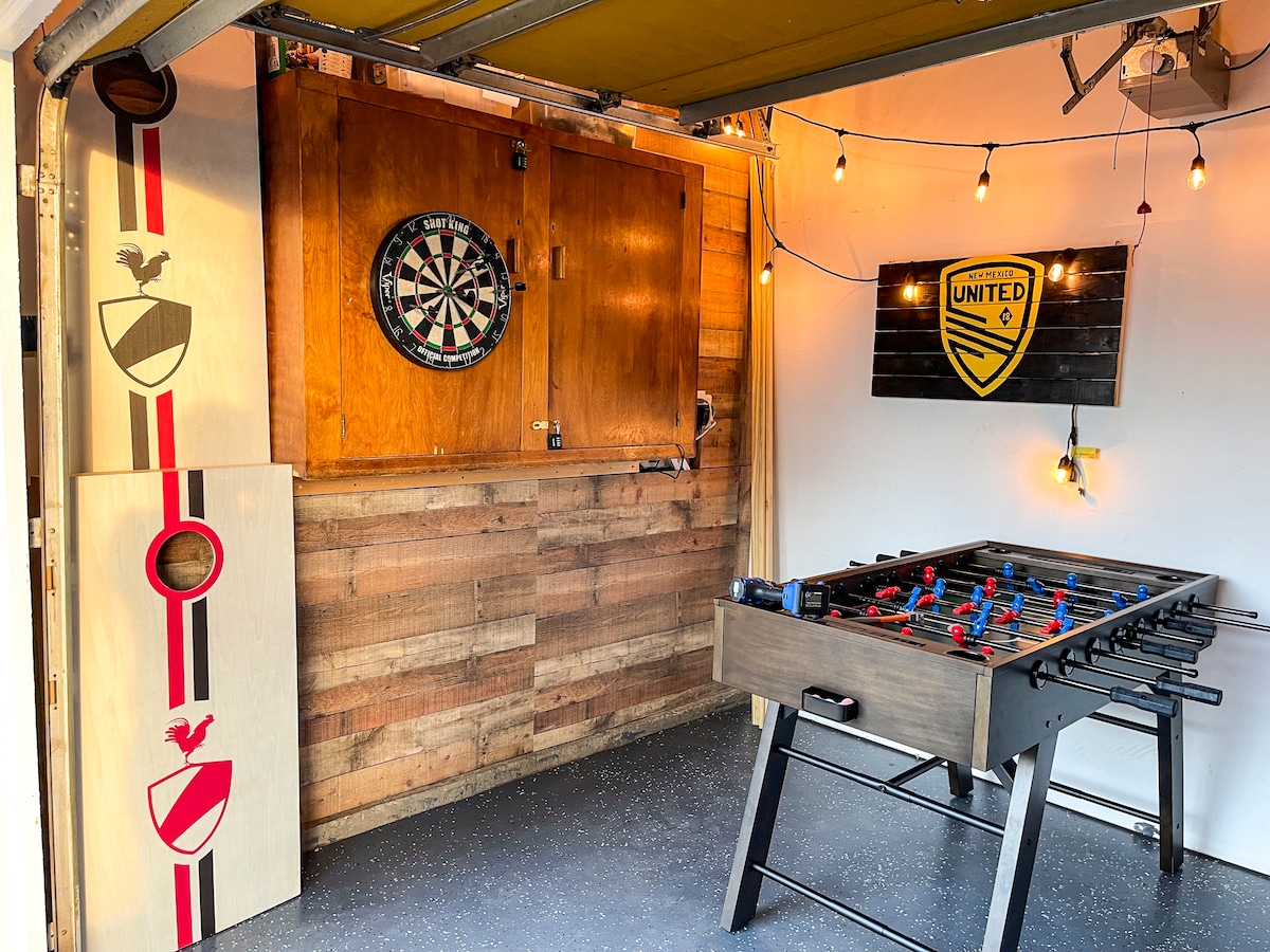 You'll be close to everything in this adventure-inspired home in the heart of Albuquerque. Perfect for couples, working professionals, and families. A short bike ride (or longer stroll) to restaurants and shops of Nob Hill. Minutes to UNM, Downtown & Old Town ABQ. This home has it all: Indoor & outdoor fire places, BBQ grill, Game Room, 65" TV with Peacock/Hulu streaming services. Adjacent to a family friendly park. 1 King, 1 Queen, 1 Queen & Full Bunk bed combo, featuring brand new Casper beds.