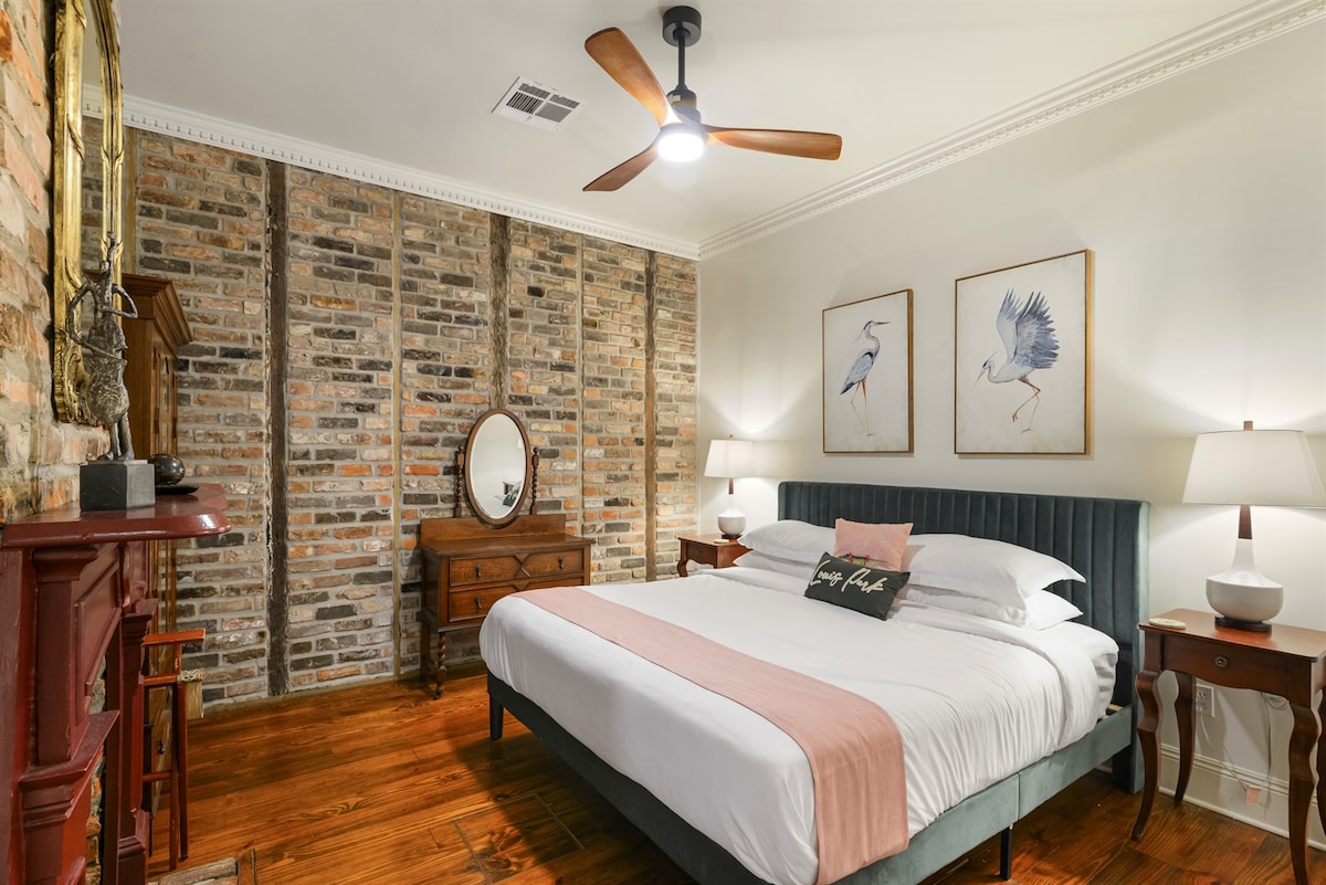 Experience New Orleans charm at the King Oliver Guest House, a tribute to jazz legend Joe “King” Oliver. Located in historic Treme, just three blocks from Bourbon Street, it features a king bedroom, a living room with a queen sleeper sofa, and a full bathroom with a shower. With exposed brick walls and beams, this guest house combines authentic ambiance with modern comfort. Relax on the shared patio in the secure compound, just steps from the vibrant French Quarter.