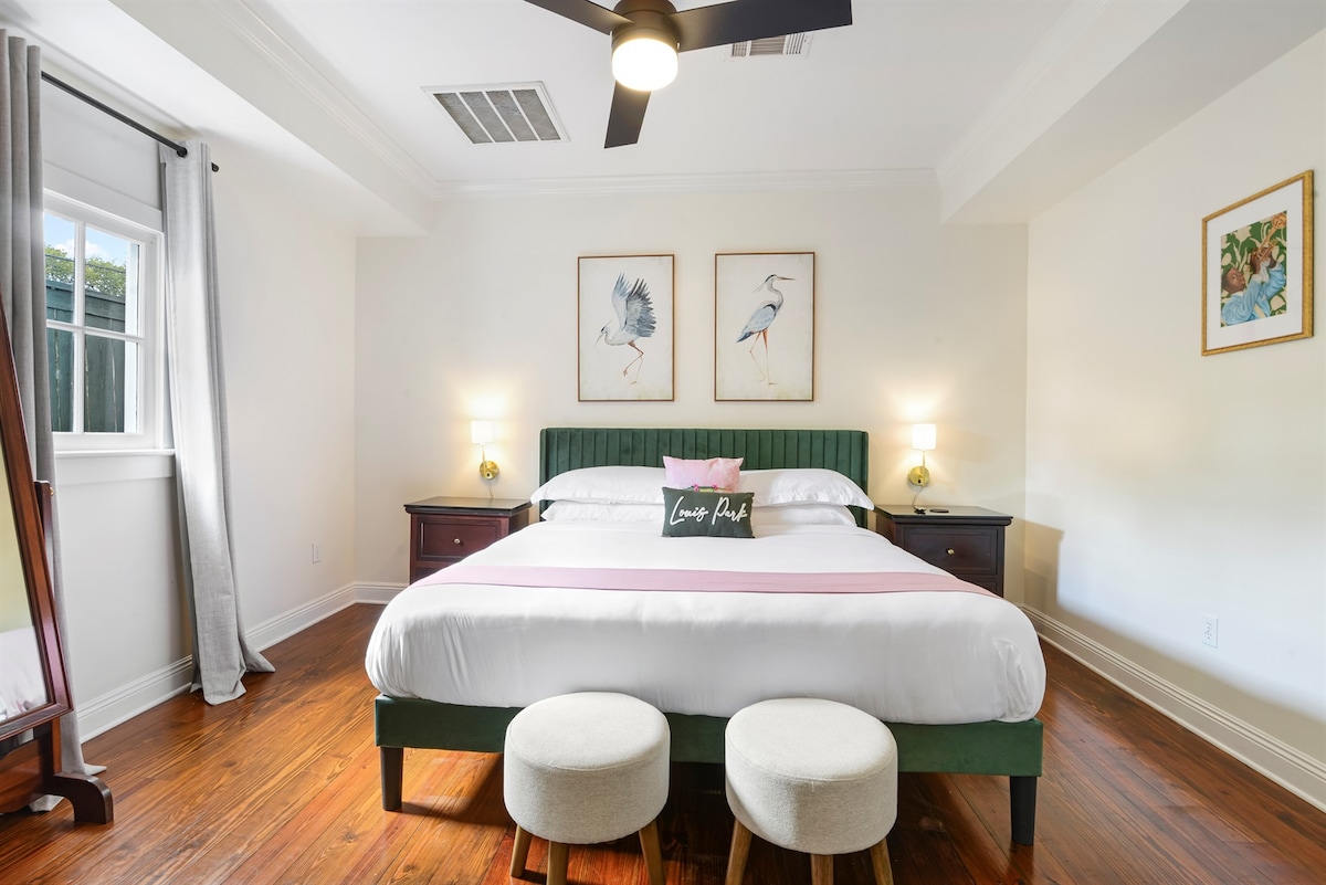 Experience the heart of New Orleans at the White Guest House, a serene retreat named for jazz clarinetist Dr. Michael White. Located at Louis Park Hotel, just steps from the French Quarter, this guest house offers the perfect blend of relaxation and accessibility. It features a king bedroom with blackout curtains, a cozy seating area, and a renovated bathroom with walk-in shower and Nexxus toiletries. Relax in the courtyard or explore nearby Armstrong Park, Bourbon St, and other iconic landmarks