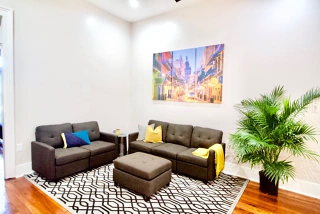 Have an authentic New Orleans experience in an 1852 building remodeled with all the comforts. The 2-BD / 2-BA condo features high ceilings and original hardwood floors, accented by modern amenities making spaces like the open-plan living room relaxing and inviting. The condo comes equipped with a full chef's kitchen as well as a dining table. Enjoy the tranquil beauty of our courtyard after a long day of exploring.