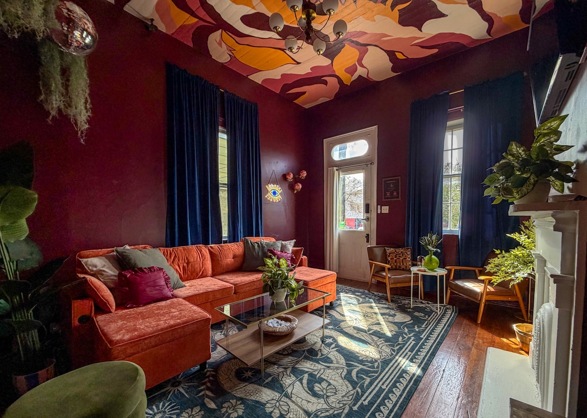 "La Lune Noire NOLA" is a boldly renovated Victorian with moody design, local art, & dark magic vibes. Eclectic nightlife, clubs & restaurants right outside your door. Short walk to Frenchmen, French Quarter & Bourbon. ★ Photo-worthy interiors packed with local art ★ Cowboy pool, backyard oasis with BBQ ★ Grocery store, arcade, food hall, 24-hour karaoke, live music & burlesque/drag within a block! ★ 2 King, 1 Queen, 1 Sofa Bed Perfect for girls trips, celebrations & unforgettable NOLA nights.