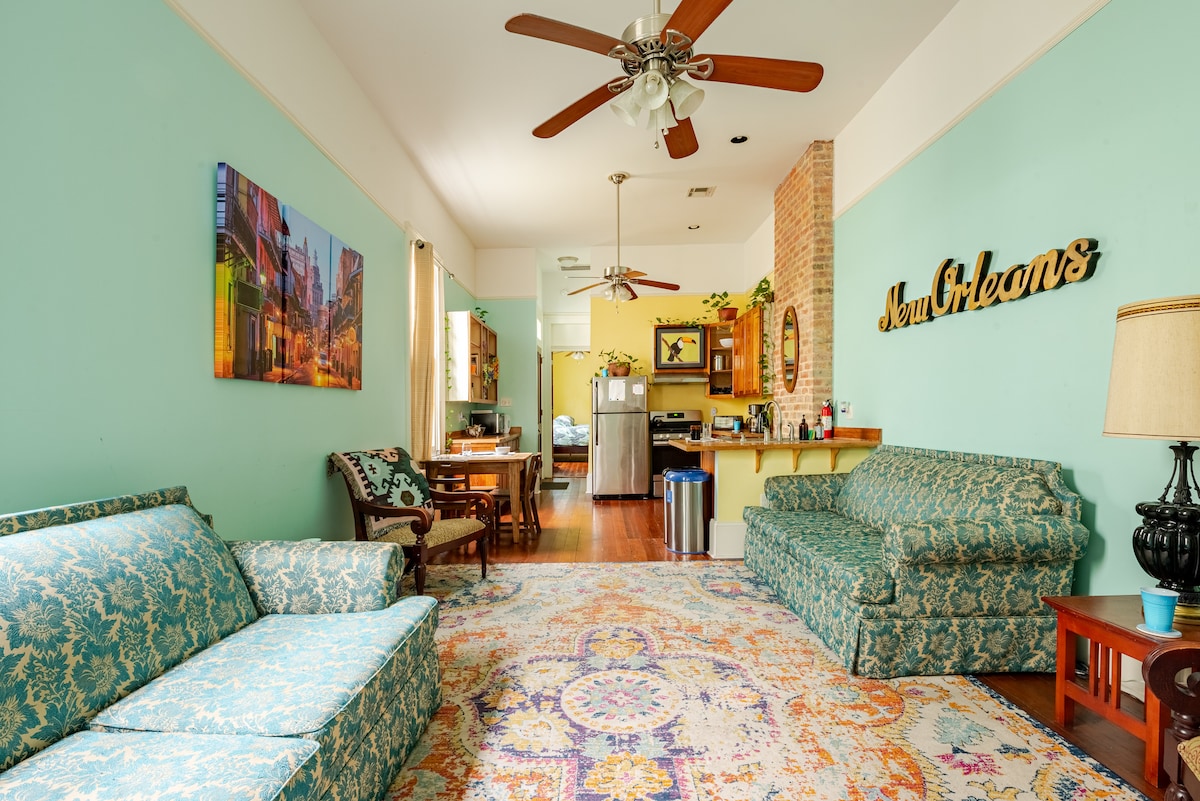 All 3 queen beds have foam mattresses. No extra charge for guests up to 6. Bedroom has queen bed, Two (2) Living Room sofas fold out. “The ceilings must be 12' or so and make the rooms appear smaller in the photos” 900 sq ft one bedroom, 1.5 bathroom unit in one story duplex 0.7 miles from busy parts of French Quarter and Frenchmen Street Paul Sarebresole, early composer of ragtime music, lived and died here We know and love our diverse neighbors I am the owner and live in the other unit