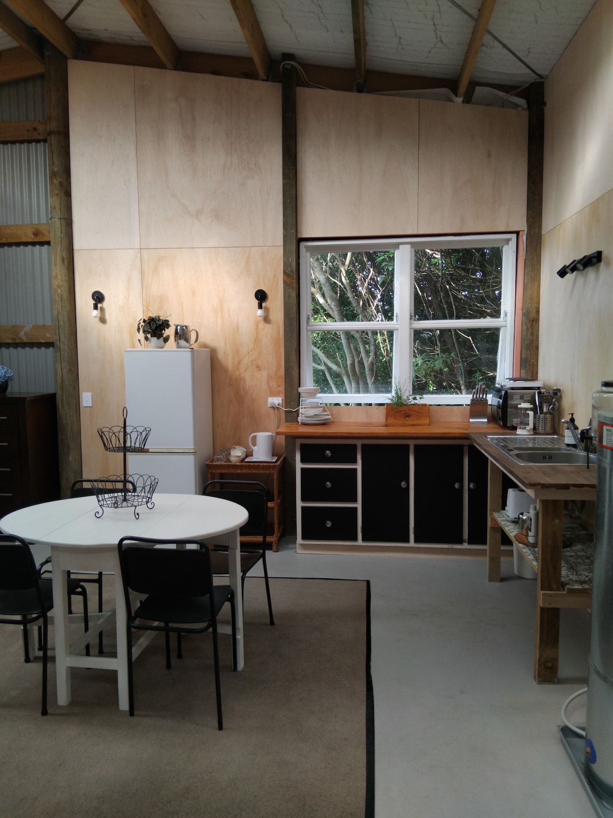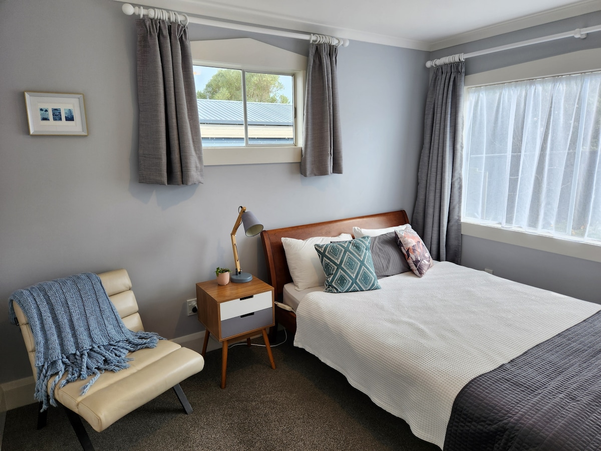 Lovely little private cabin in Fitzroy. Newly renovated and consists of a bedroom with King size bed. There is a skylight above the bed equipped with a blockout blind. The Bathroom is en-suite with large rain shower. Cosy lounge area with flat screen TV. Tea and coffee making facilities are provided along with microwave, toaster and a fridge. The French doors lead to a decked area overlooking the garden area where you can relax and unwind.