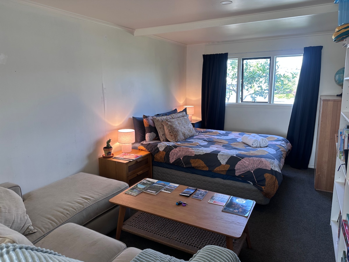 Warm sunny private stand alone sleep out with its own shower, toilet & outdoor kitchen . Sky TV sport. 500 mt from beach, river, village with pub, restaurants & cafes. Tranquil rural setting with mountain/beach/bush outlook. Abundant bird life in large garden setting. Queen bed (extra single on request $50, If required please book 3 persons, or charged $75 on arrival). 10 minutes New Plymouth. Quality surf breaks and golf courses nearby. All nationalities welcome. Discounts longer stays.
