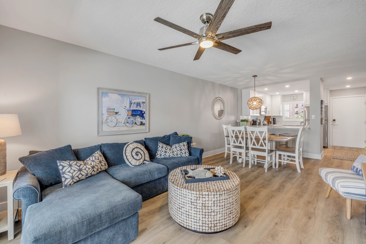 Step outside and immerse yourself in the ocean or a pool in minutes! Escape for days or weeks to this lovely renovated home, just a short stroll to pristine, no-drive New Smyrna Beach. Nestled in a resort-like setting, our condo features modern amenities and cozy comforts for an ultra relaxing stay. We provide towels, chairs, and all beach essentials for your seaside adventure. The huge enclosed veranda is perfect for lounging and dining in privacy. Visit this oasis to relax, refresh and renew!