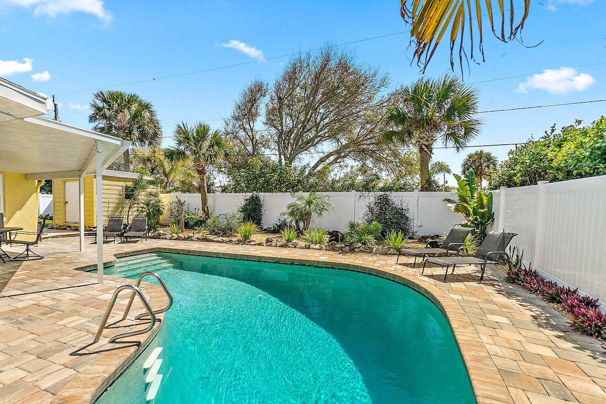Shake off the stress of everyday life and come relax at our beautifully renovated pool home with 2 bedrooms and 1 and a half baths on a quiet street close to restaurants and bars in Ormond by the Sea. Minutes to the private beach access at one end of the street and minutes to the intracoastal waterway at the other end of the street with overlook area and kayak launch. Covered lanai overlooking private pool with 4 loungers and outdoor shower.