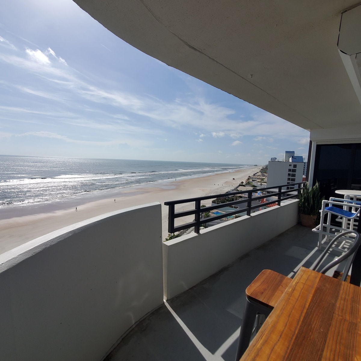 Oceanfront studio condo with a beautiful view. with wide shared balcony with seating. The current rate reflects ongoing storm-related repairs and closures of some amenities. Ideal for guests who value being close to the beach and ocean views over perfection and understanding the challenges. Some recently opened: **Open Amenities • 8:00 AM – 8:00 PM • One Outdoor Pool • Indoor Pool • South Spa • Fitness Center / Gym • Sauna **Primary guest registration with ID required through guest portal.