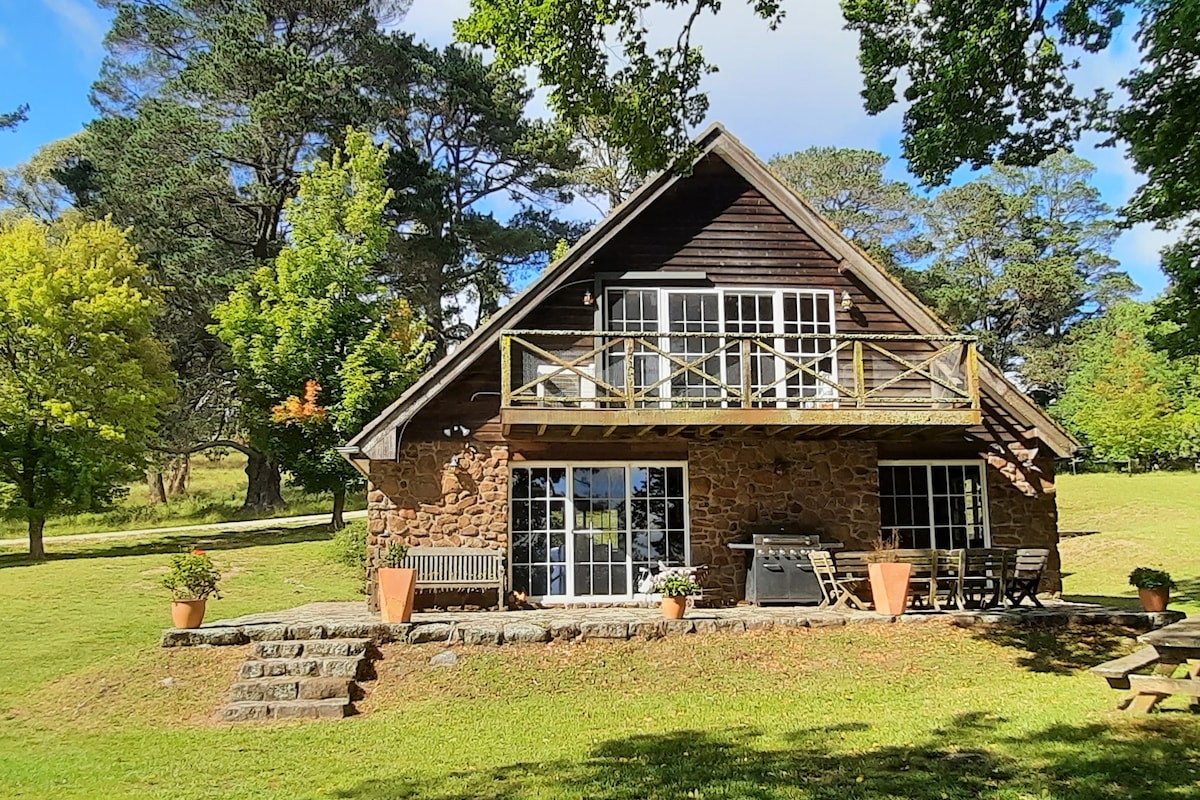 Highlands Lodge is a magnificent stone and timber chalet nestled amongst 150 year old deciduous English Elm and many other European Trees. It is beautiful year round but particularly in Autumn. Located at Black Mountain (approx. half way between Sydney and Brisbane) in the heart of the beautiful New England Region, it is only 25 minutes north of Armidale and 10 minutes south of Guyra. Set on a working Sheep and Cattle property, Highlands Lodge is the perfect place to relax and unwind.