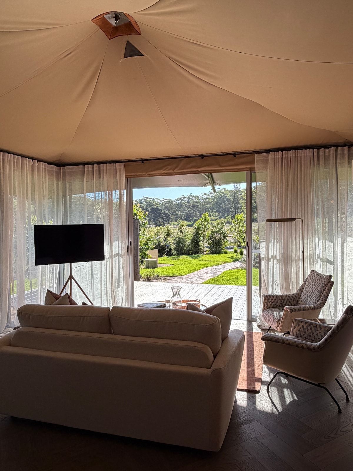 Bush Belle Glamping Relax amongst the mango tree's looking out towards the ocean its time to unwind. Enjoy all the comforts of the belle tent with its queen size bed, luxury linen & offgrid bathroom (all linen provided). As night falls relax under the stars with a red wine. Beautifull gardens provide plenty of bird watching. Its a bird lovers paradise! Your dog is also welcome with plenty of lawn to run , The property is just 10mins from Ballina in an acerage estate Come stay relax & enjoy.