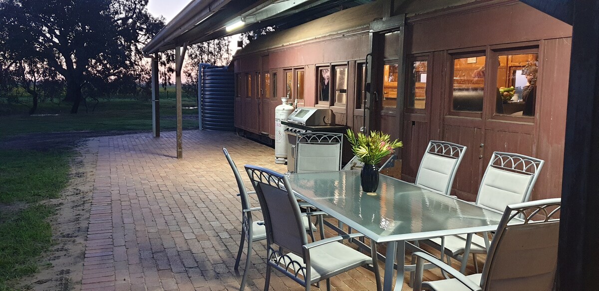 Relax unwind and enjoy privacy and tranquility, spectacular sunsets, star watching, outdoor bath, fire pit, bush walking, bird watching or bring your own bicycle and cycle around the quiet country roads. Spacious self-contained accommodation for a single or a couple with all the comforts of home in our renovated "Red Rattler" train carriage The perfect rural retreat for your getaway....stay a while and explore the Riverina or take a peaceful one-night break on a long distance journey.