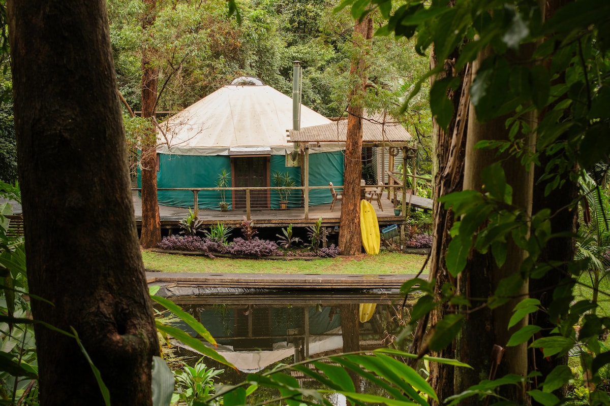 Enjoy a unique experience in a beautiful self-contained yurt with stunning hinterland views. Includes private deck and access to a beautiful lagoon pool and hot tub. A short drive to the wonderful hinterland villages of Clunes and Bangalow. Relax and revive in complete serenity.