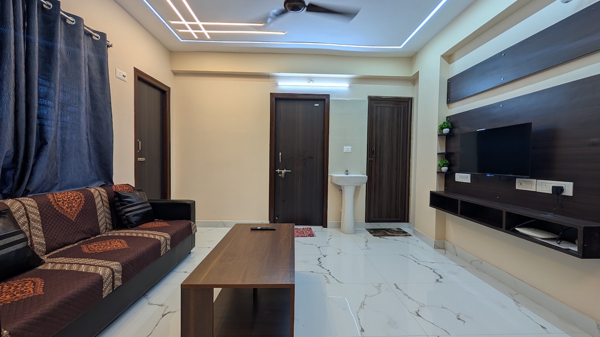 Two Bedrooms Apartment near Biswa Bangla Gate Newtown,standalone building .The property in 1st Floor with Lift . Biswa Bangla conference Hall, Tata Medical Cancer, DARADIA plain clinic , Snehodiya old age home, Axis Mall, Pride etc very close. Sector V is easily accessible. TV with WiFi , Wash M/C,Hair Dryer, AC, Kitchen Utensils are available Property is kid friendly. space for movement. Mosquito net, Feeding chair-table and bath tub is available. Pickup drop on request and availability