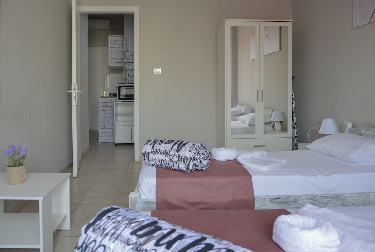 Αυτός ο μοναδικός χώρος έχει το δικό του στιλ. Διαθέτει διπλό κρεβάτι, μονη κρεβατόπολυθρονα,πλήρως εξοπλισμένη κουζίνα, ιδιωτικό μπάνιο, τηλεόραση επίπεδης οθόνης,WI-FI, μικρό λειτουργικό μπαλκόνι και πάρκινγκ (παρκάρετε μπαίνοντας στην οικοδομή αριστερά κάτω από τα μπαλκόνια αν υπάρχει θέση αλλιώς ελευθερα στα γύρω στενά). Ιδανική επιλογή για να γνωρίσετε την πόλη μας. Σε κοντινή απόσταση υπάρχουν: φούρνος, φαρμακείο, σούπερ μάρκετ, καφετέριες, ταβέρνα και εστιατόρια.