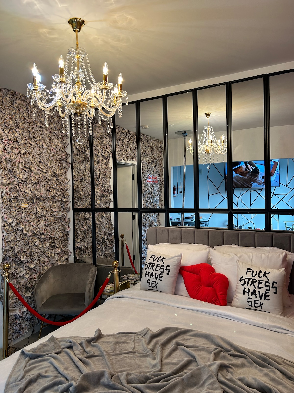 This unique place has a style all its own. We just know you're going to love your stay at our Luxe Glass house 3 .Get a good nights rest on our Queen mattress. Walk into a custom mirror background including a beautiful crystal chandelier in the bedroom with plenty of fun!! . Full of entertainment, money wall , exotic dance pole & secret glow room !!! This room is not for children under 18