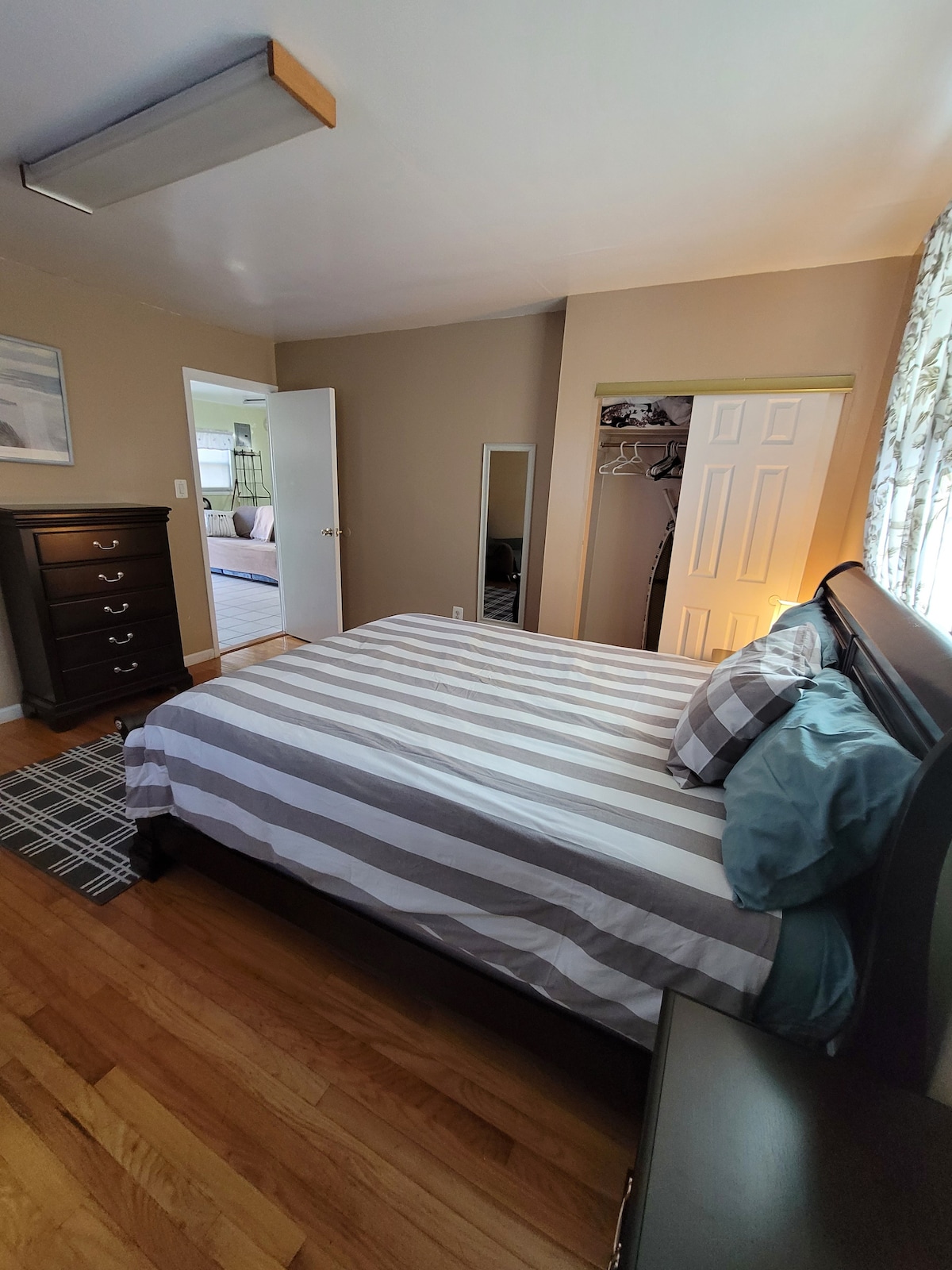 One spacious bedroom apartment with King size bed and walk-in-closet. BRIGHT AND CLEAN, refrigerator with filtered water (door), washer and dryer, warm toilet seat, flat screen TVs (2) free ROKU internet. Beautiful living room (with sofa bed), dinning room, kitchen, office space- move in ready!Safe area/security camera outside. Street is a cul-de-sac, peaceful. Entire use of outside. Barbecue grill available. LGBT friendly.