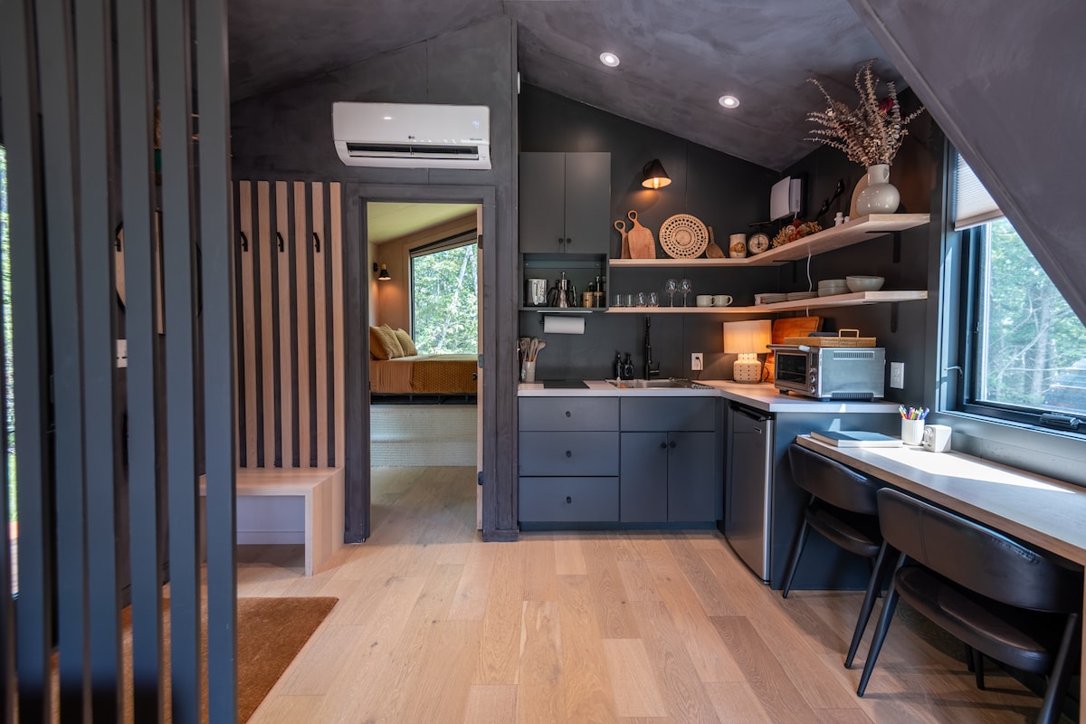 A Treehouse. Reconnect with nature at this unforgettable escape. Nestled in 28 acres of woods with hiking trails. This unique newly constructed all electric 525 sq foot elevated structure offers a wrap around deck for an ever changing view. King size bed & new technology foam offers complete comfort in separate climate controlled bedroom. Heated bathroom floor is a “warm” surprise. Optional seasonal outdoor shower for the adventurous. Kitchen lacks nothing tucked conveniently in the great room.