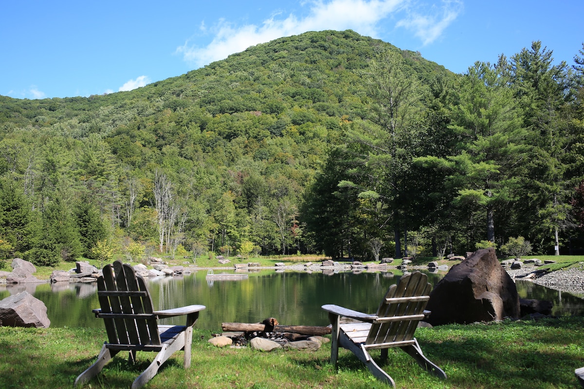 Modern Scandinavia-style riverfront bungalow on 8 acres. Sit on your deck with twinkle lights for coffee/dinner filled w sounds & views of a rushing river; walk across the river into your own private swimming spot! Perfect for a nature retreat, hiking, swimming, fishing (stocked every April), skiing, work w mountain views or write that novel you have always wanted to finish. 2 hrs from the George Washington Bridge. Level 2 EV charger. Hate has no home here-all are welcome.