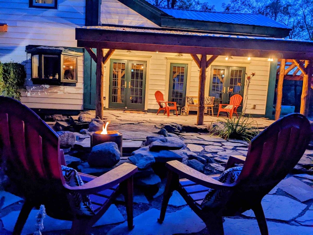 The Creek House: a fully renovated 1 bdrm, 1 bath home with a full modern kitchen and large new deck situated right next to a year round babbling brook. The creek is 15 feet from the foot of the deck stairs; its sounds lull guests to sleep each night. Frogs, salamanders, crayfish, and all manner of forest life abound. The stream meanders through the mixed park like and wooded parcel ending at a 25’ wide 6’ high waterfall. Antique clawfoot tub. Water may have a sulfur smell (see below).