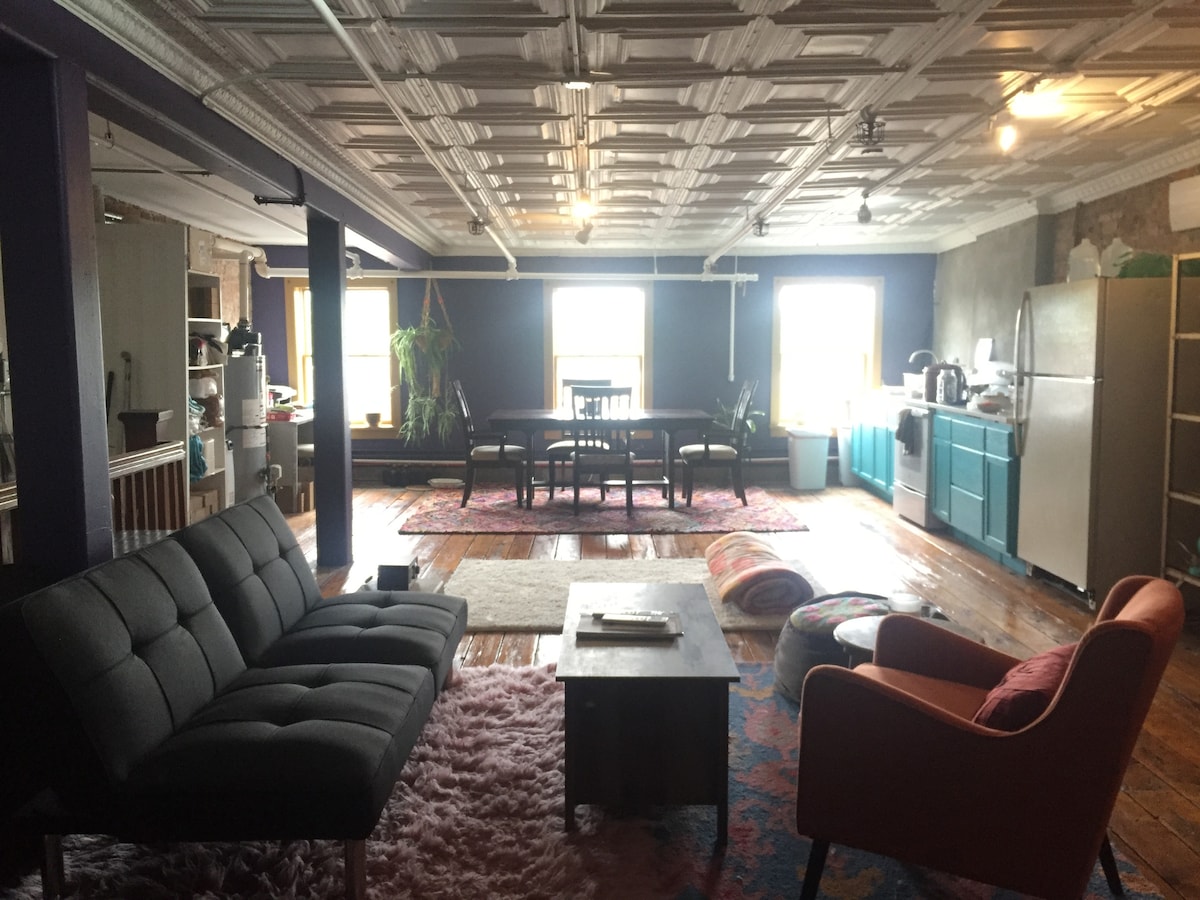 Large storefront converted to colorful open plan apartment in the heart of downtown Troy. Blocks away from RPI, and steps away from most of Troy's nightlife. Warning: this urban bohemian experience may bring back memories of Williamsburg Brooklyn or Downtown LA in the 90's. Note that sounds from outside and adjacent apartments may bother light sleepers, so don't book this one if that is a concern for you. Also parties are not allowed because of close neighbors! Thanks!