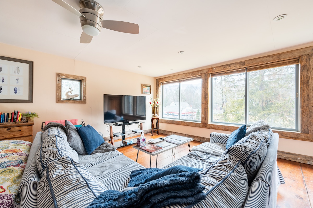 Luxury loft studio w/elevator and parking right on Main St- Home of Applefest, wineries & farmers markets. Walk to all the great restaurants & shops. Skiing nearby! Steam shower, Zero Gravity adjustable bed w/ massage. Designer kitchen, Kardiel velvet sofa /sleeper, Electric fireplace, 60” HD SmartTV. Cozy window seating w/views perfect for morning coffee! Keurig, coffee, tea, & bottled water provided. Relax & indulge- leave the cleaning to us at check out!