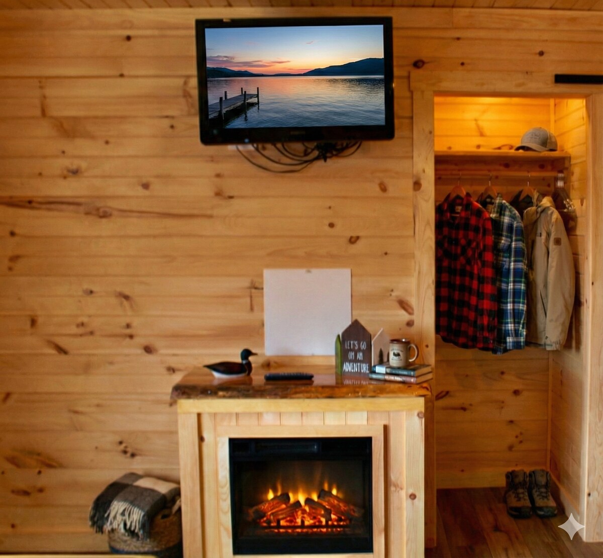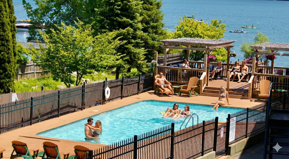 Designed for couples seeking a cozy Lake George escape, this intimate king studio features a fireplace, jacuzzi tub, and warm Adirondack charm. Perfect for anniversaries, weekend getaways, or quiet retreats for two. While the space is intentionally compact, it’s rich in comfort and atmosphere. Enjoy access to the pool, hot tub, beach, firepit, and free kayaks and paddleboards—ideal for guests who plan to be out enjoying the lake and village.