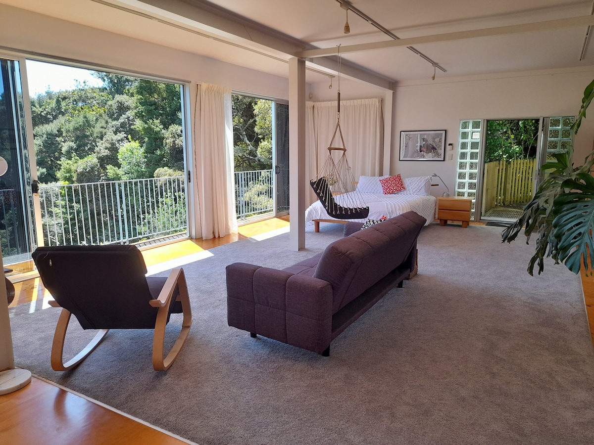 Relax at a unique and tranquil getaway, cosy, romantic and immersed in nature. An open plan studio nestled next to a gentle stream on the native forested foothills of Whale bay, Raglan. An easy 6 min walk to the surf at Whale bay, Indicators or Outside Indicators a few mins drive to Manu bay or Ngarunui beach. Warm and cosy with a beautiful open fire, modern insulation & large double glazed sliding doors. The heat pump heats the studio within 15mins.