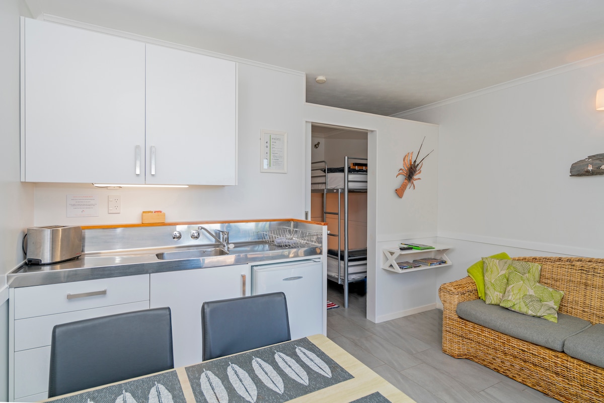 Small kitchenette with mini fridge, jug, toaster, tea/coffee Lounge area with TV, dining table and chairs, and couch Double bed and single set of bunks in one bedroom The double bed is made up with full linen and towels The single set of bunks only have a bottom sheet, pillow and pillow case, and throw blanket. Room servicing every second day