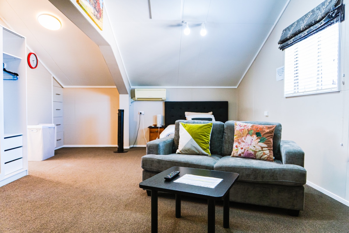Relax in our sunny, fully renovated 109-year-old barn loft—rustic charm with modern comfort. Enjoy a comfy orthopaedic queen bed, spacious lounge with a sofa bed and heat pump, private bathroom, and a well-equipped kitchenette. Wake to birdsong, meet our friendly dog, cats, and hens. A peaceful “bit of country in the city” with off road parking. Close to supermarket, 7 mins from the CBD & express way to all parts of the city and Mount. Perfect for both business travellers and holiday makers.