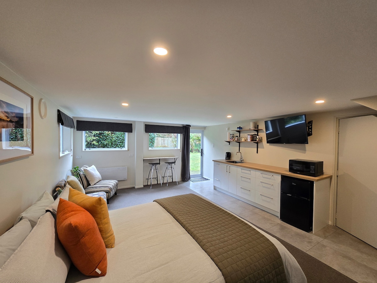 Welcome to Minaret - you'll enjoy a cozy and private stay in beautiful Wanaka. Our retreat offers stunning mountain and lake views, a beautiful park-like garden, and private external access. You'll sleep soundly on our comfortable Californian king bed, and have all the amenities you need, including a large flat-screen TV and a kitchenette with a microwave, hot plate, toaster, kettle and mini fridge. Just a few minute walk to the lake and tracks and plenty of parking for a car and the boat