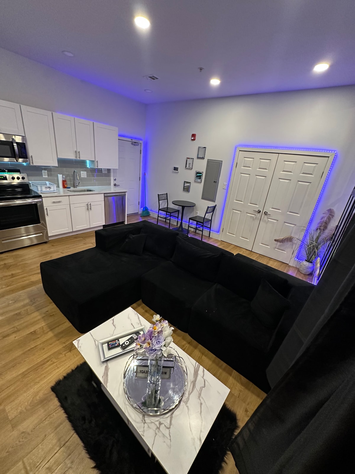 Beautiful, cozy, sunny room with a super comfy L-shaped sectional sofa. Super clean and spacious fully equipped Eat-in kitchen with dishwasher, stove, oven, microwave, regular and K-Cup coffee makers, Micro-wave, Toaster, Pots, Pans, Utensils, and Silverware all provided. The apartment includes (2) 43" Flat Screen TVs; streaming HULU-Live, Amazon Prime, Disney Plus. Also, a little work desk area provided Free washer/dryer access and Free parking, (short-term lease available).
