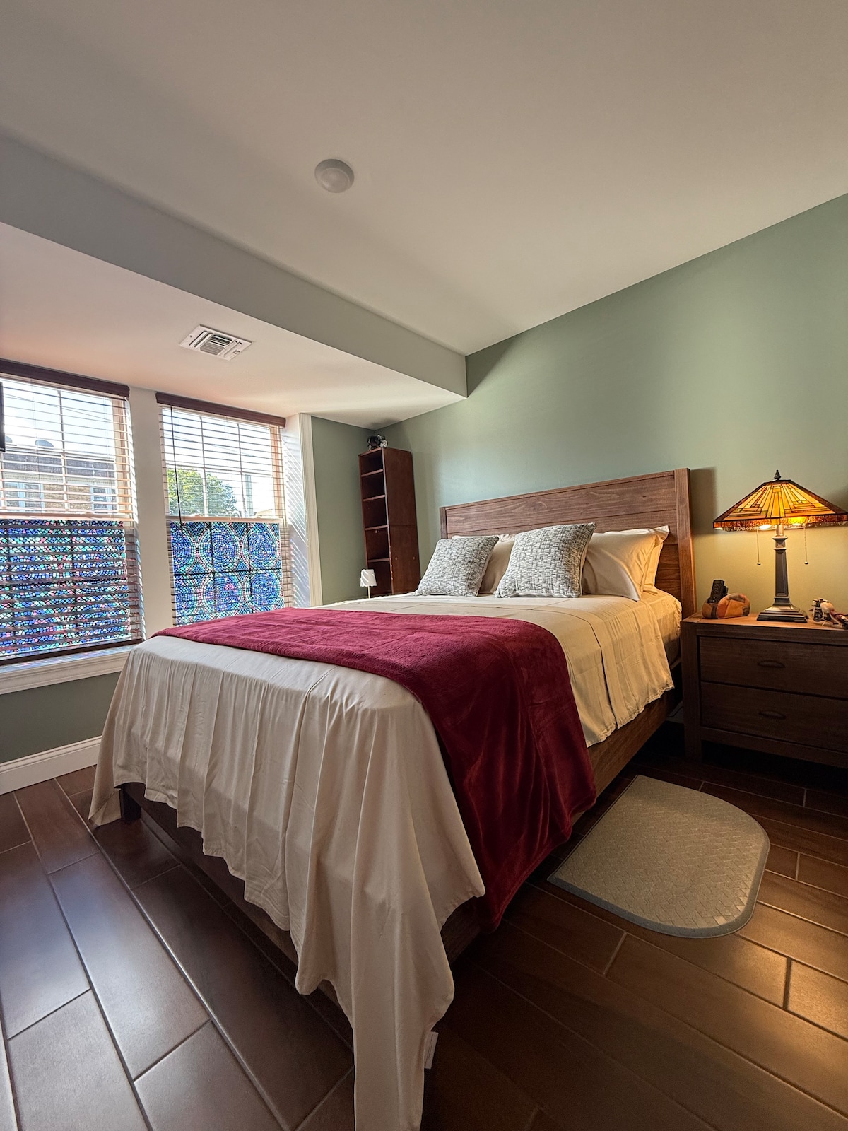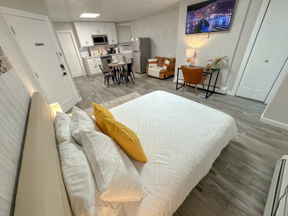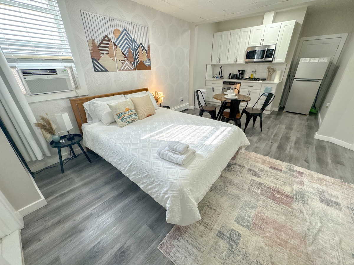 This meticulously curated Japandi-inspired studio is perfect for remote work or a peaceful retreat. The space features a cozy queen bed, small loveseat, and seating area. Enjoy high-speed internet, TV, and a writing desk for productivity. The suite includes a kitchenette with a fridge, microwave, and coffee maker. Located in a quiet, safe neighborhood, with access to a backyard fire pit for relaxation. Ideal for a calm, comfortable, and productive stay.
