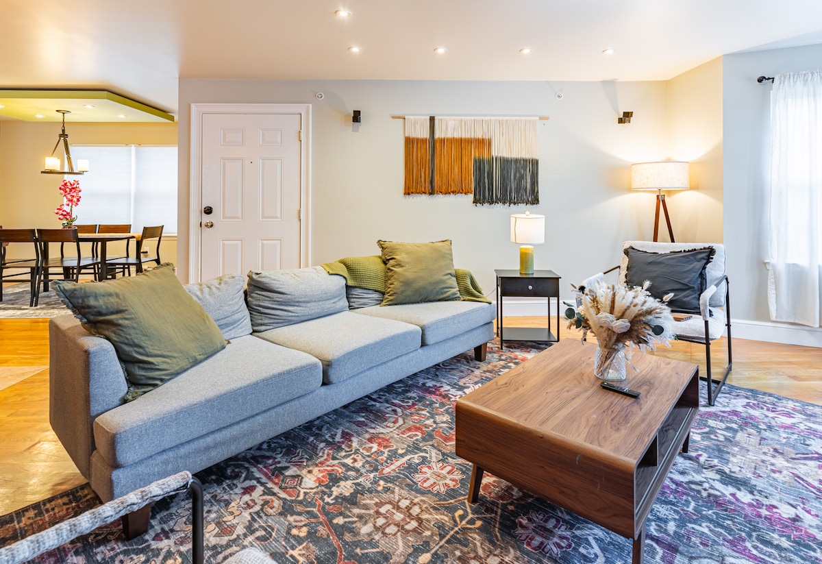 Inviting room in a beautifully renovated 1920s craftsman colonial. Just a stroll away from the Mid-Town Direct Train, connecting you to Manhattan or Summit, NJ. Enjoy a new kitchen with stainless steel appliances and a spacious island for dining and socializing. Convenient onsite washer and dryer, a generous living room with an entertainment system, street parking, plenty of storage and even a hot tub. Easy commute to nearby colleges and hospitals and . Your cozy stay awaits!