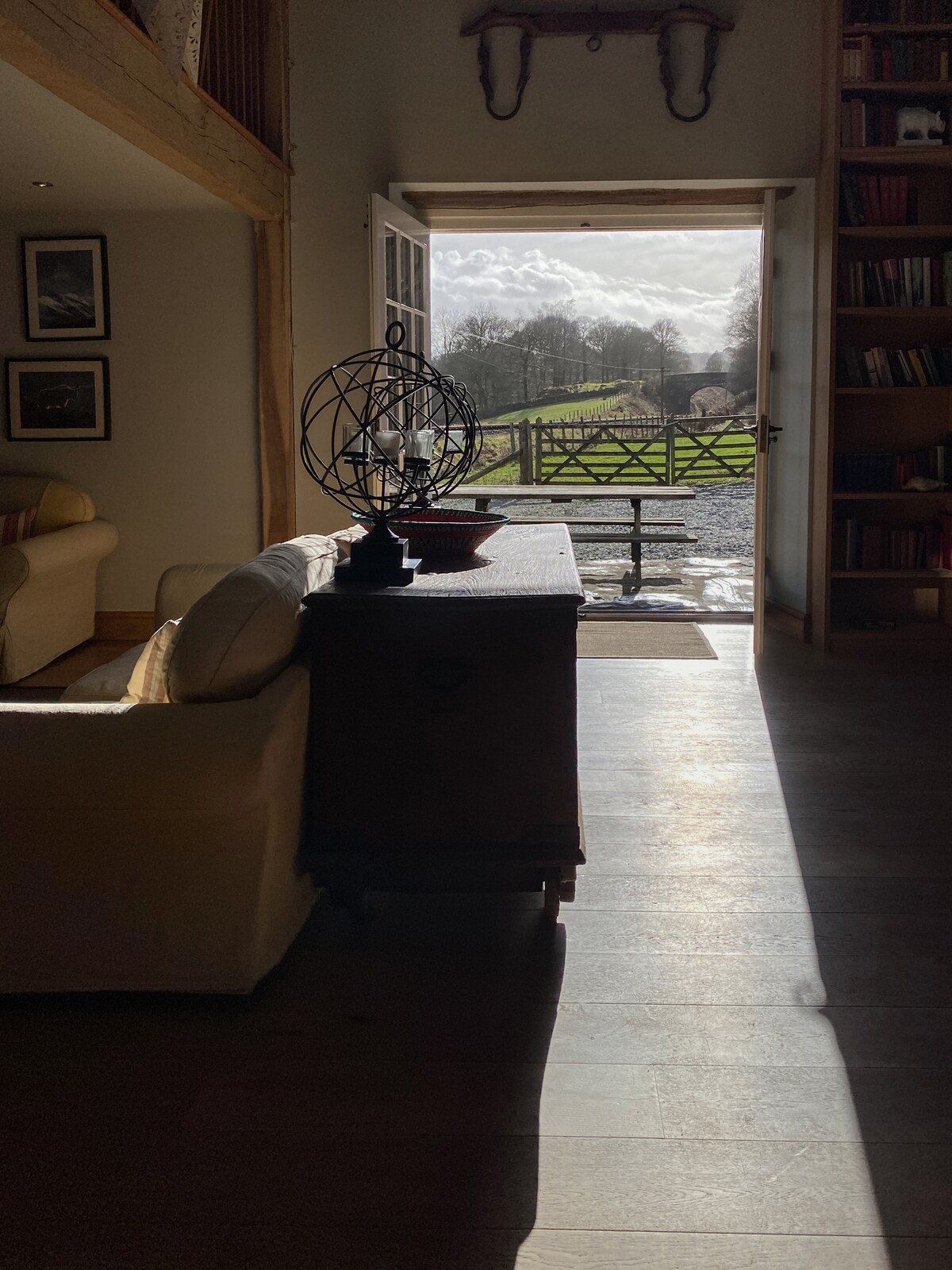 The Barn has an open mezzanine floor with a super-king bed . The main open plan area is very large and could be used as a venue for celebratory dinners (up to 40), yoga retreats etc , most conveniently when rented in conjunction with Waterside House.
