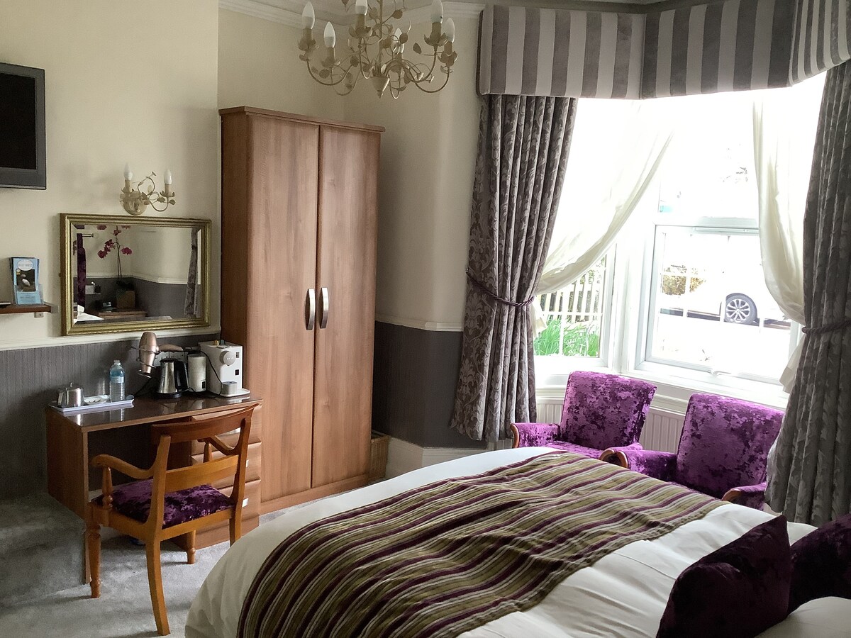Our only purpose made Double room overlooks the garden and has an ensuite bathroom that has a basin, toilet and electric shower. There is tea, coffee and complimentary biscuits in all rooms along with freeview Tv with built in Dvd player. A double wardrobe with hangers is sited in the corner of the room and a bedside lamp and central heating make this a very cosy room.