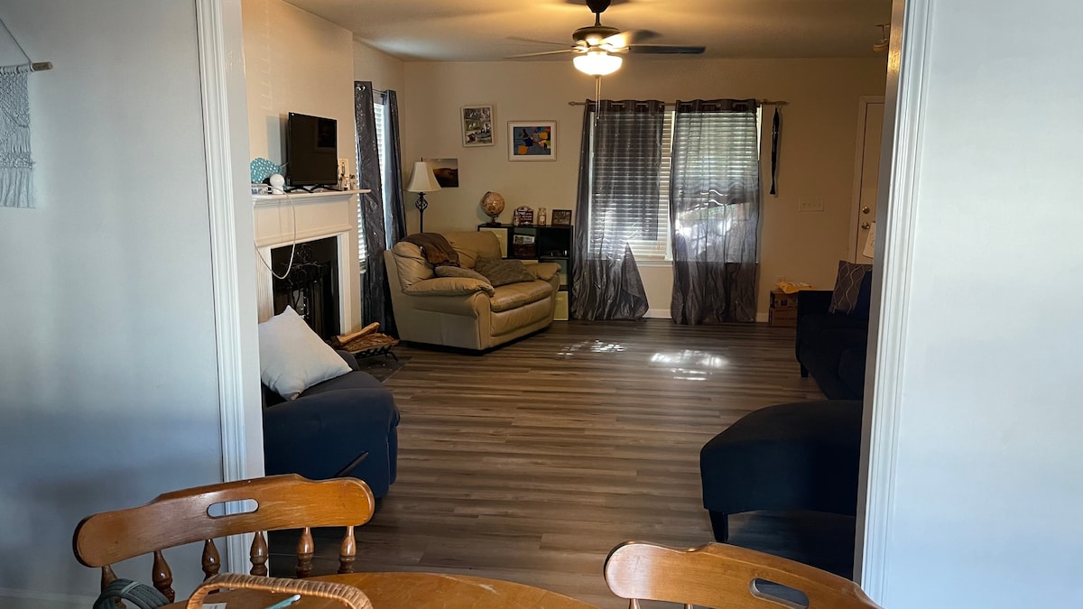 Contemporary 3BR bedroom, 2BA, single family home located in a quiet neighborhood cul-de-sac. Our home will make a comfortable base for your visit and features an open floor plan with great accessibility, no stairs inside and only one step up from the driveway. High speed cable internet and wifi is provided for entertainment on our 50 inch TV. The kitchen is set up with basic cookware and dishes. Work space/desk in Master. Washer and dryer access included. Linens, pillows and blankets included