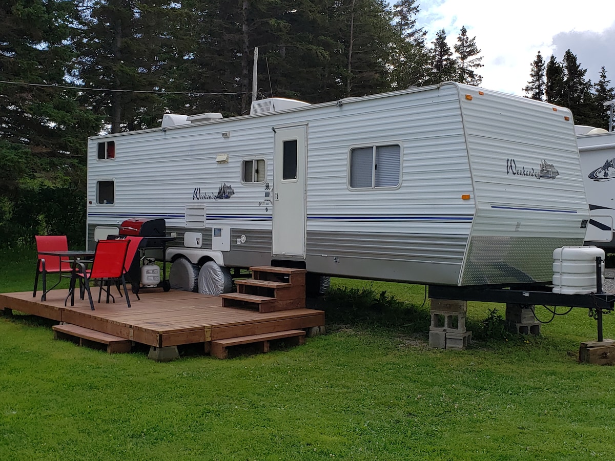 Beautifully renovated RV walking distance to magnificent Salmon Cove Beach/hiking trails. Wake up to a symphony of birds on a private forested campsite. Experience the adventure in a fully equipped and cozy minihome with all the comforts. Stroll on the endless sand and surf where a freshwater river meets the ocean. Hike the Trail of Eagles. Enjoy an abundance of berry picking spots. Cast your line in Harry's Pond. This rare find is only 75 mins from St. John's and 10 mins from Carbonear.