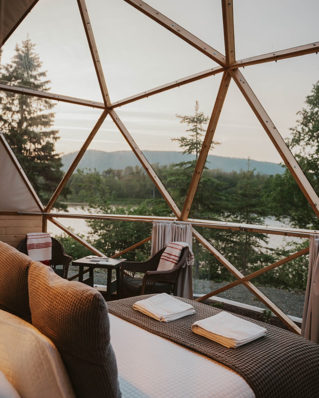 Experience luxury glamping in Flatlands, NB! Our insulated domes at Old Church Cottages offer a serene adult-only (18+) retreat under the starlit sky, surrounded by the Restigouche River and mountains. Enjoy heated floors, AC, a full kitchen, and a modern shower. Unwind in your private hot tub, open year-round, with patio furniture and BBQ in summer. Please note: Fixed check-in at 4 PM NB time Old Church Cottages is Open year-round