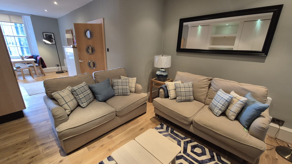 Stylish Georgian Townhouse flat in Edinburgh’s New Town UNESCO heritage site dates from 1825. Being 2 floors up, there are amazing views northwards. This quiet apartment is ideally situated close to the heart of the city - walking distance to most major attractions including Holyrood Palace, Playhouse Theatre, Princes Street and the Old Town. King-size bed (UK), bath & shower, comfortable living area, fully equipped kitchen with dining area for 4 people. NB - there is no lift in building.