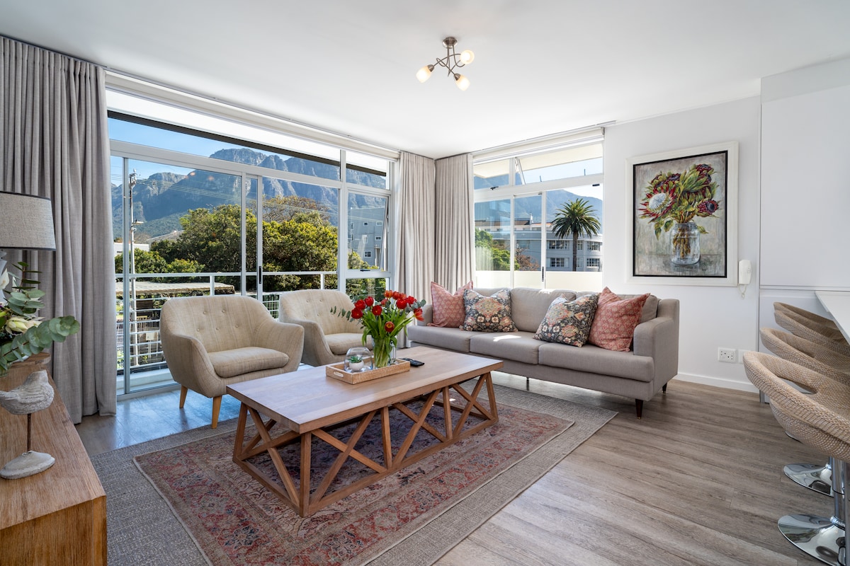 Unwind in this spacious apartment combining elegant mid-century design with contemporary luxury. Electricity inverters so no loadshedding .Take advantage of being walking distance from restaurants and amenities, and enjoy awe-inspiring views of Table Mountain from the large, exclusive deck. View and magnificent location with wifi and cable TV, fully equipped kitchen .Newlands is close to the city but still has a village atmosphere where you can walk from place to place feeling secure . Mountain walks from the premises and restaurants down the road . Remote gates through to secure parking for only one car Fully serviced flat which is part of a bigger house , please note there are dogs on these premises Newlands is a natural gem. It's close to beautiful mountain walks, great restaurants, and supermarkets. It is centrally located and an easy drive either to the southern suburbs or the Atlantic seaboard. Uber is usually a couple of minutes away - very easy access to different parts around Cape Town we have a Nespresso Machine and Laundry service if needed